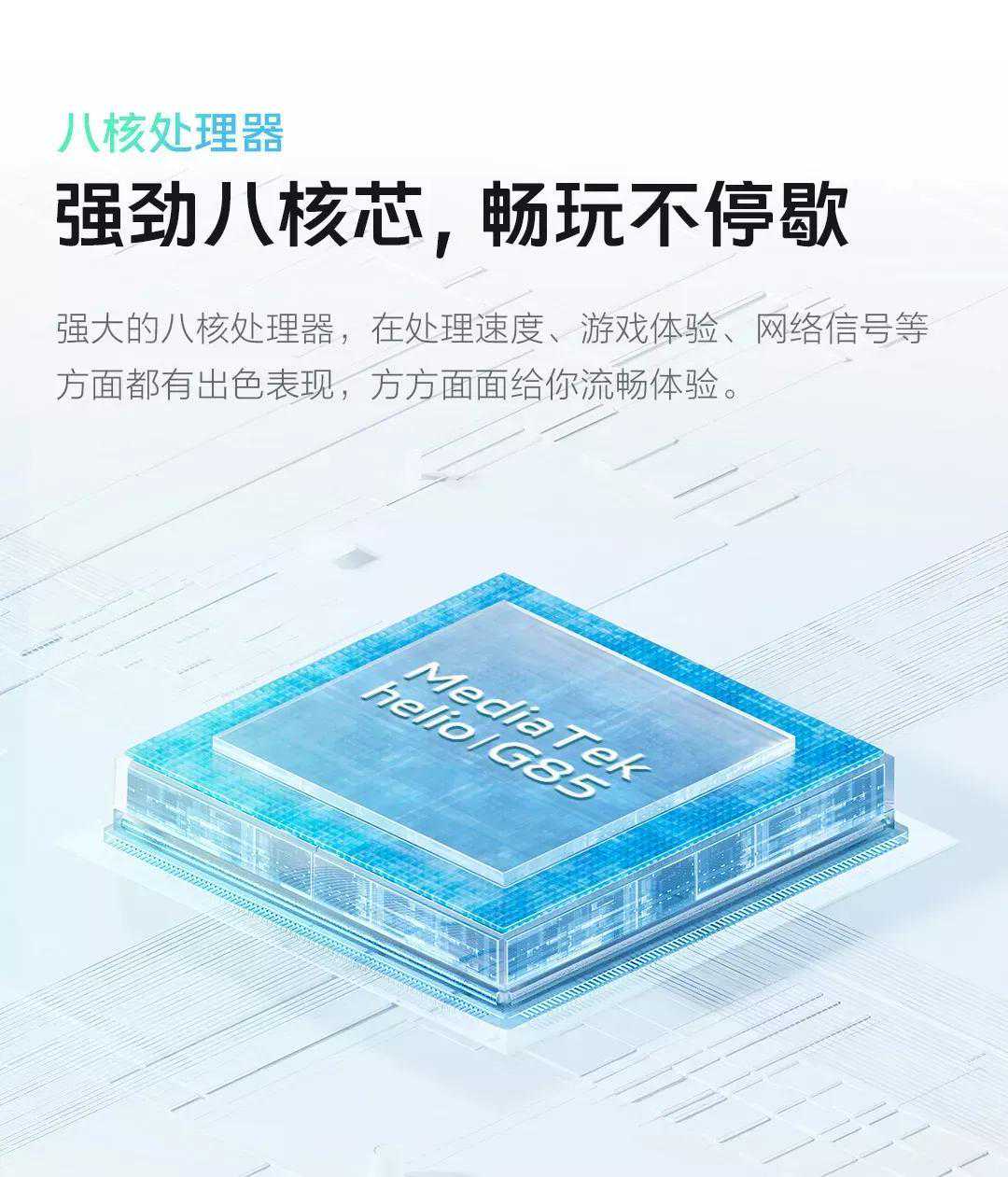 搭载上市于2020的联发科G85处理器,12nm工艺制成,A75大核,最高主频2.0GHz,安兔兔V8版跑分16—20万左右。