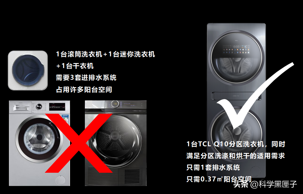2.其次分区洗衣机比较节省位置,有人会纳闷,明明体积更大了,怎么节省位置?但如果不选择分区洗衣机,则需要添置两台洗衣机,可能还需要准备一台烘干机,所占空间反而更大了,而选择分区洗衣机一台即可搞定全流程。