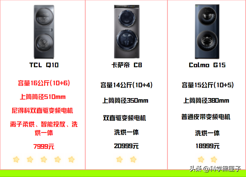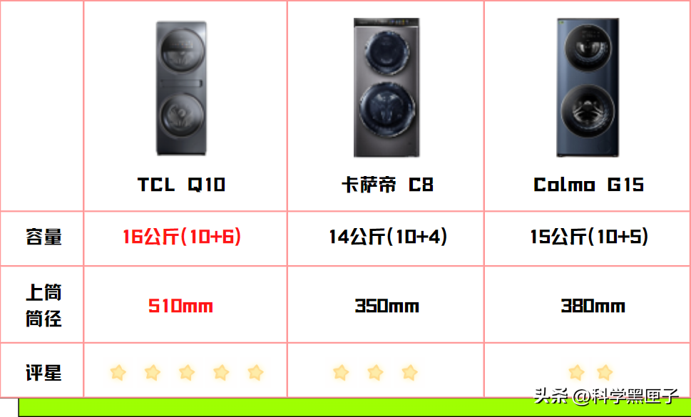 我们比较一下TCLQ10、卡萨帝C8和ColmoG15三款洗衣机的容量和筒径: