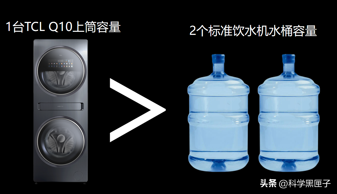 看得出TCLQ10具有绝对优势,行业最大的分区洗涤容量和行业最大上筒径让TCLQ10的洗衣能力独具一格,6kg大上筒可以装42L水,我们常见的饮水机水桶也仅有18.9L,所以TCLQ10的上筒容量比两个饮水机水桶还多,可以轻松洗涤儿童4件套,对于窗帘、床单被套等大件的清洗也省时省力,非常轻松。