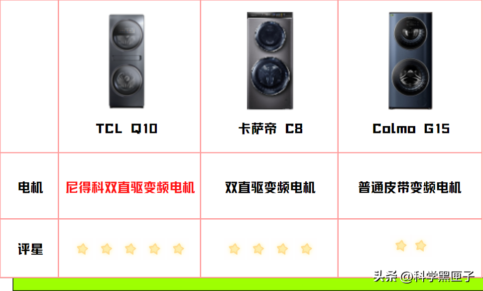 我们对比一下TCLQ10、卡萨帝C8和ColmoG15三款洗衣机的电机水平: