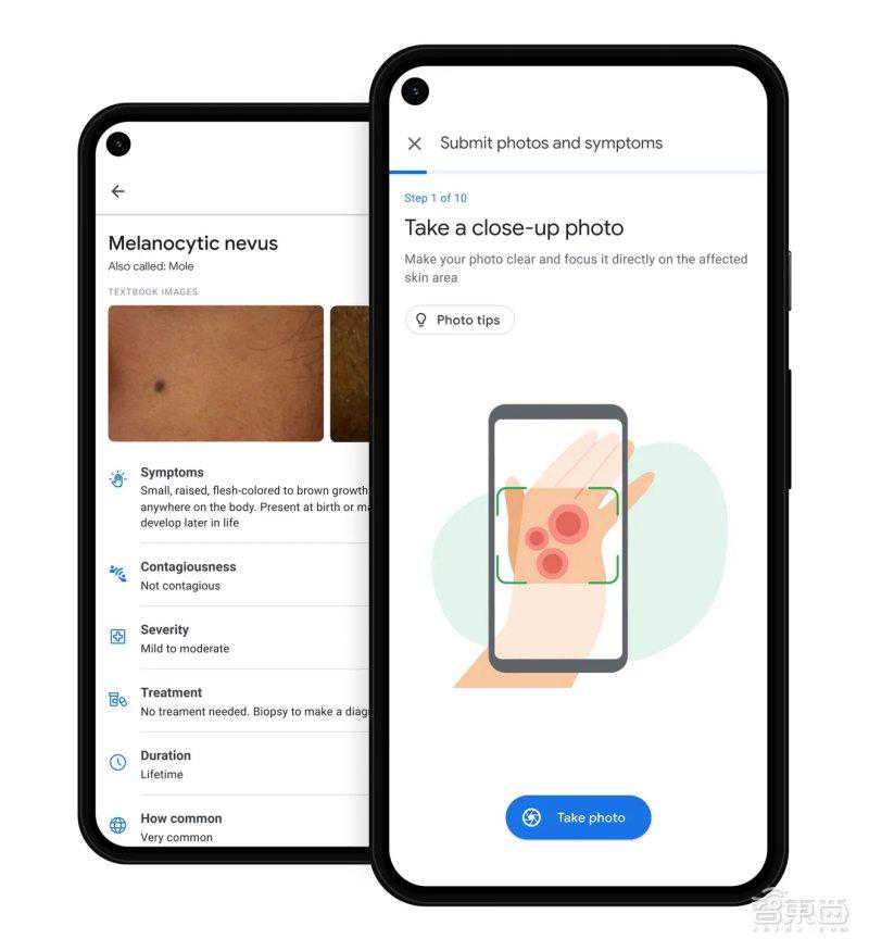 基于此项技术,谷歌正在尝试利用AI,通过检测皮肤、头发和指甲,帮助人们了解自身身体状况。具体点说就是,人们使用手机拍摄下身体出现异常的部位,然后该技术将从具有288例的数据库中进行症状识别,并给出相应的治疗方案。