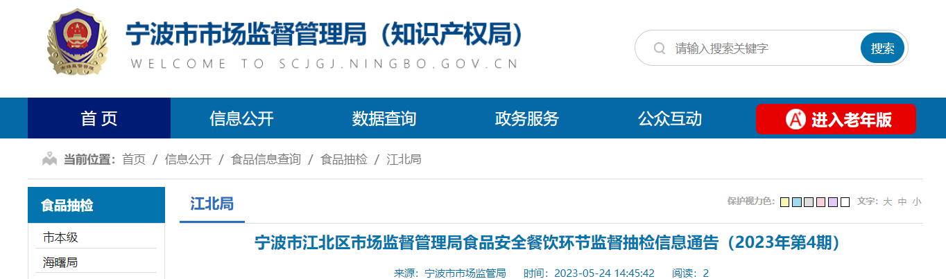 中据浙江省宁波市市场监督管理局网站2023年5月24日消息,宁波市江北区市场监督管理局发布食品安全餐饮环节监督抽检信息通告(2023年第4期)。
