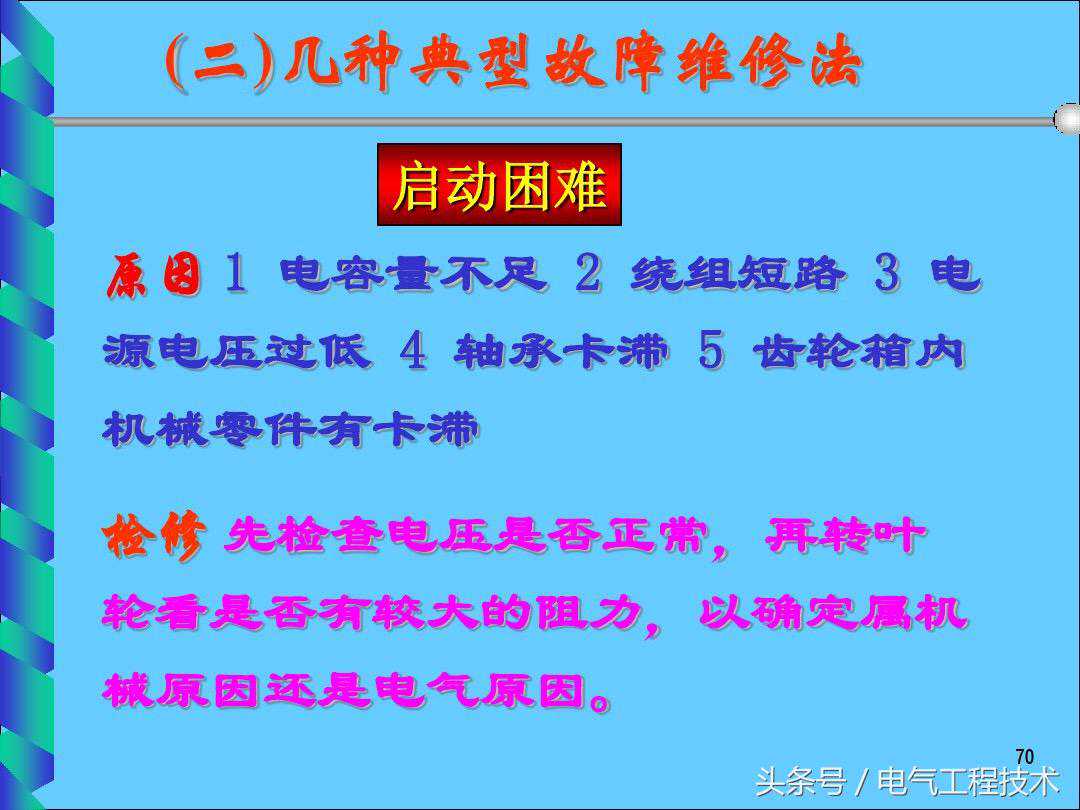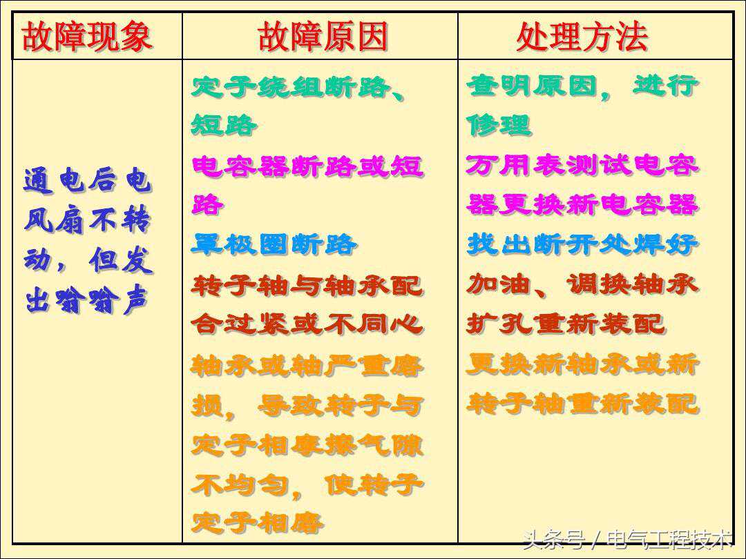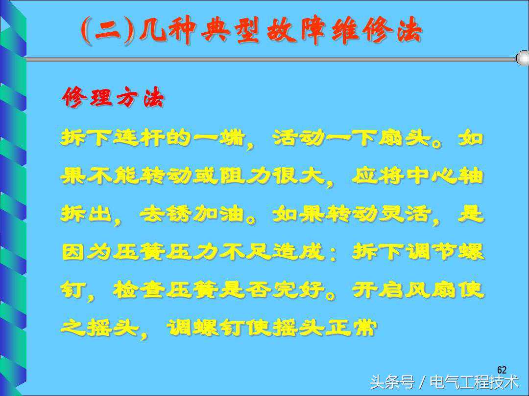 电风扇是大家都非常熟悉的电器,大部分的家庭都会使用到,对于电风扇的电路,相对比较简单,一般情况下,电风扇出问题故障了,一般的电工师傅都可以搞定,这是电工基础的技能,但是对于刚入门学习电工的师傅就不同了,虽然简单,但是因为没有相应的理论知识和动手实践经验,所以在电路故障的排查过程中自然也会比较慢,其实电工师傅们都知道,电风扇本身的故障就没那么多,高频发的故障也就那么几个,如果有电工师傅总结好了,就可以直接拿来维修使用了,今天我们就重点来看一下电工师傅总结好的25个电风扇常见的故障排查以及解决方法,希望可以对于电工初学者有帮助: