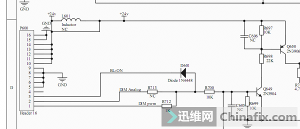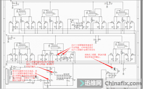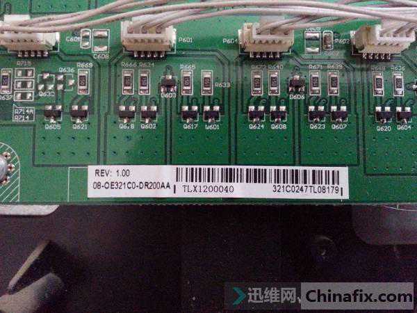 发现背光开启信号(BL-ON)和亮度调整信号(DIMPWM)都有3V左右的电压,说明恒流板的控制信号正常,问题出现恒流板本身,于是我去测量Q649的基极,发现基极没有电压,分析电路得知,如果Q649基极没有电压,Q649将会截止,从而导致Q650截止,Q650截止会使Q601-Q612Q617-Q628均截止(因为这些管子的基极没有电压)。这些管子截止就会使灯条供电形成不了回路,所以灯条肯定不亮。