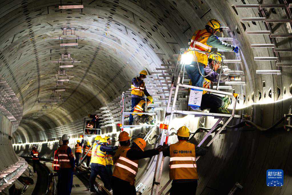 4月29日,在济南地铁3号线稻香站,中铁十局的工作人员在进行弱电系统通信专业电(光)缆支架安装作业。