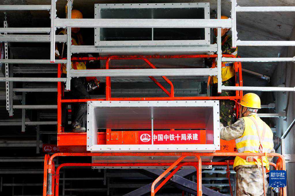 4月29日,在济南地铁3号线稻香站,中铁十局的工作人员在进行机电安装工程排烟系统耐火风管安装作业。