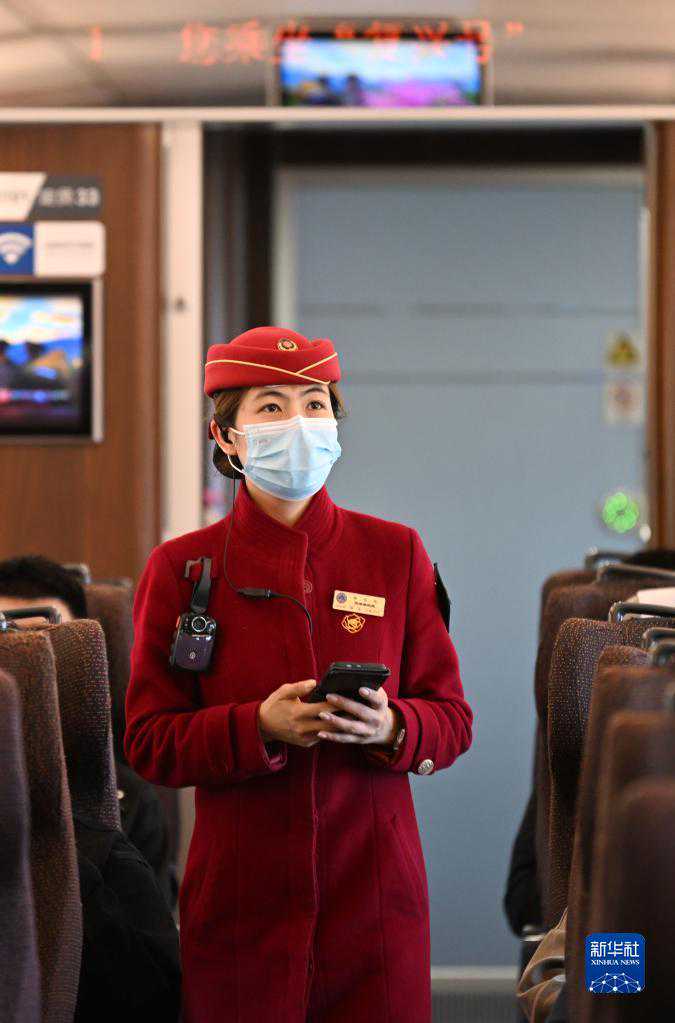 4月29日,京津城际C2569列车长在查看旅客行李摆放情况。