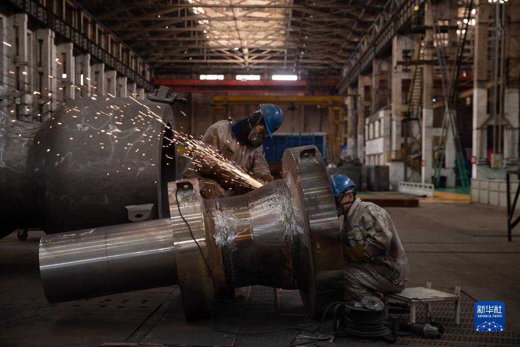 4月29日,工人在哈电集团哈尔滨汽轮机厂有限责任公司车间内生产作业。