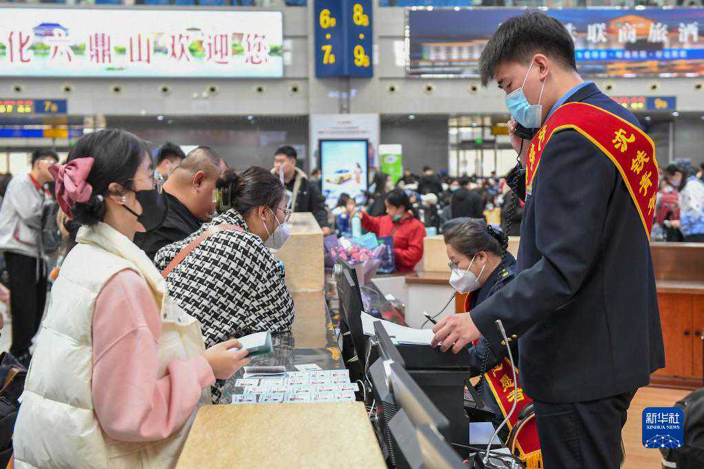 4月29日,长春站候车大厅的工作人员解答旅客问询。