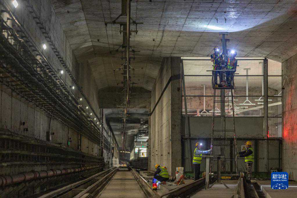 4月29日凌晨,在重庆轨道交通九号线保税港站,中建五局安装公司的施工人员利用夜间窗口期进行接触网施工。