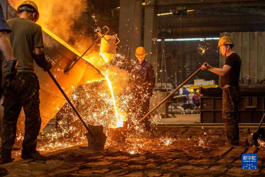4月29日,在安徽省芜湖市繁昌区孙村镇的芜湖久弘重工股份有限公司生产车间里,工人在砂模上浇铸芯骨料件。