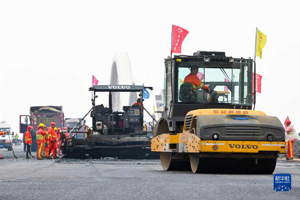 4月29日,建设者在江苏省昆山市同丰大桥进行沥青摊铺施工。