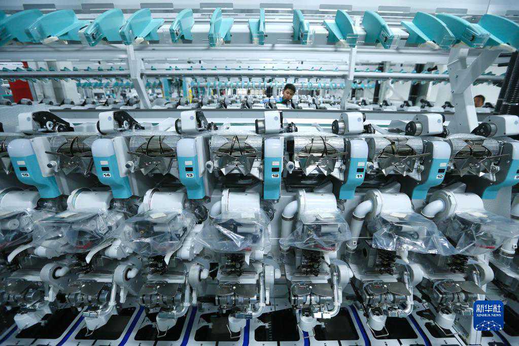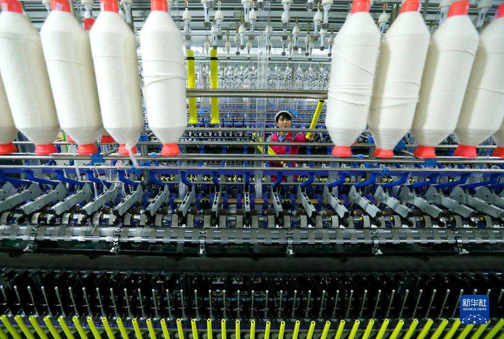 4月29日,技术工人在山东省青岛市即墨区即发龙山工业园的一处数字化智能纺纱工厂安装生产设备。