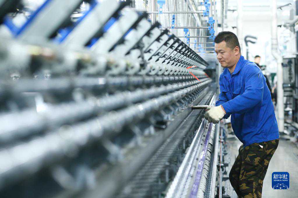 4月29日,技术工人在山东省青岛市即墨区即发龙山工业园的一处数字化智能纺纱工厂调试生产设备。