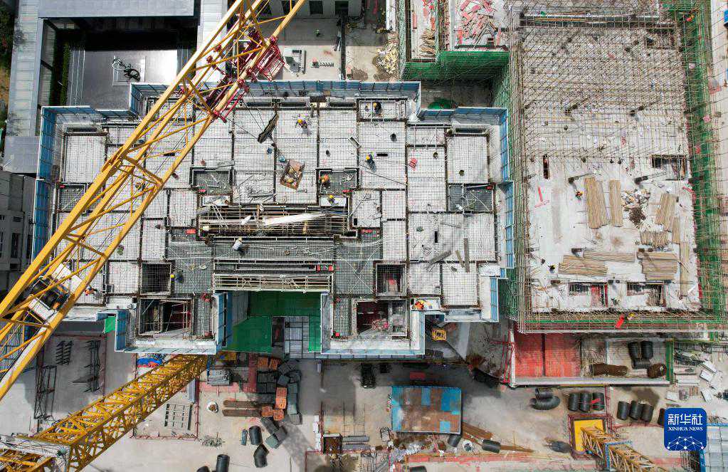 4月29日,工人在合肥林店家园安置房项目工程施工现场忙碌(无人机照片)。