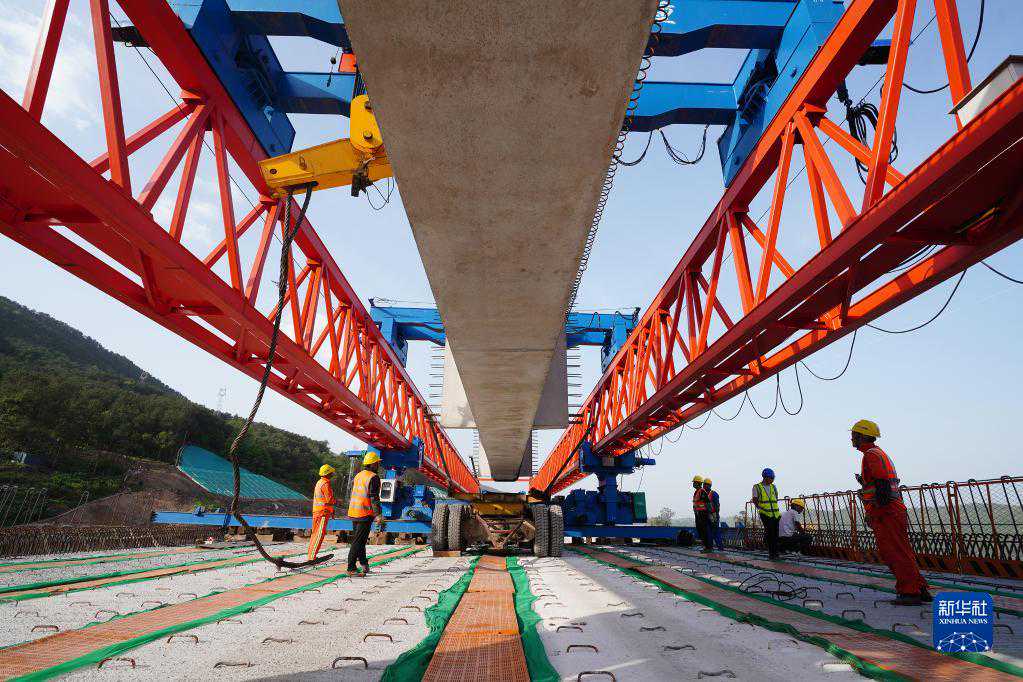 4月29日,在重庆市北碚区渝武高速公路复线项目施家梁立交施工现场,中交一公局施工人员在进行T梁架设。