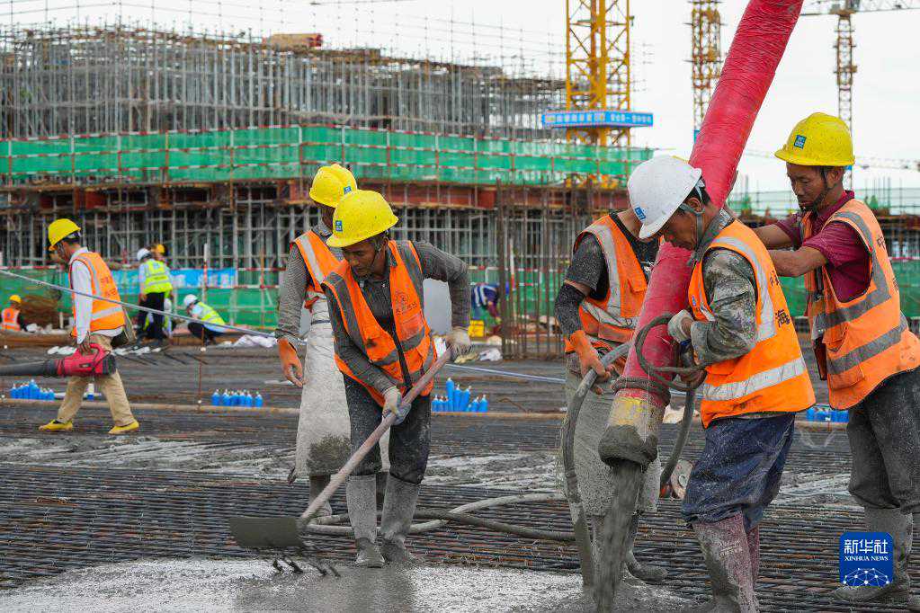 4月29日,中建三局参建人员在广州白云国际机场三期扩建工程T3航站楼项目现场浇筑混凝土。