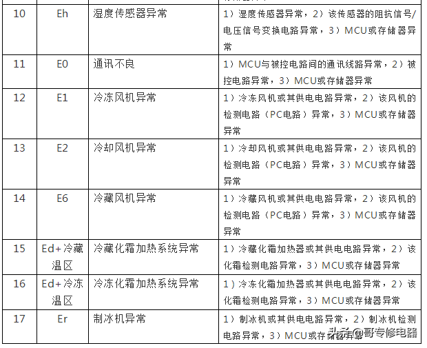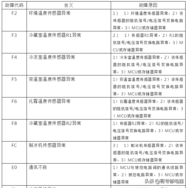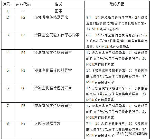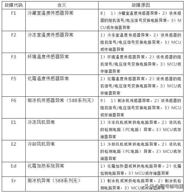 表1海尔BCD-579WE、BCD-626W/649WADE/BCD-628***/649***系列电冰箱故障代码及其原因