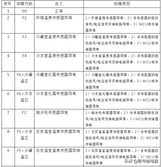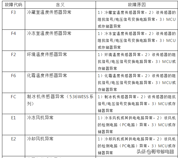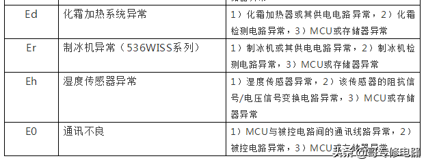表3海尔BCD-586WS/586WSF/586WSG/586WSL/588WS/588WSF系列电冰箱故障代码及其原因
