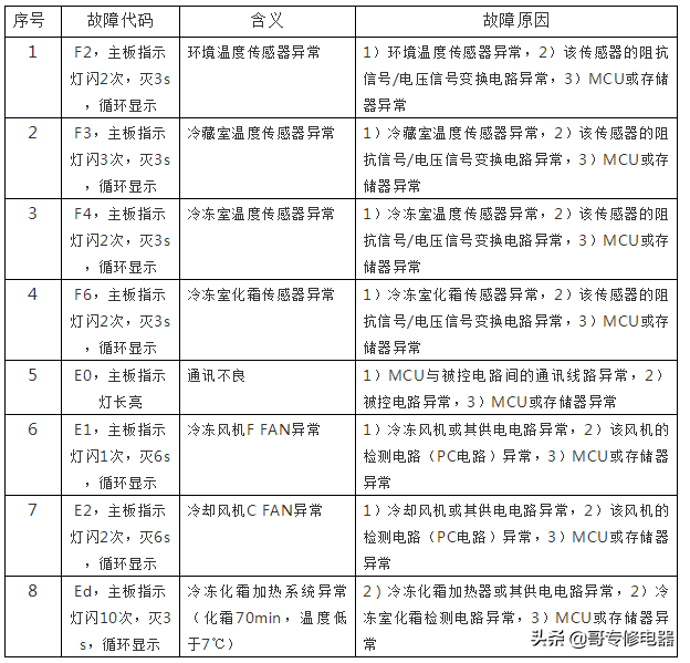 表2海尔BCD-801WDCA系列电冰箱故障代码及其原因