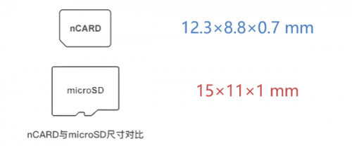 ▼根据官方规格,microSD卡(667x)尺寸为15×11×1mm,NM卡(nCARD)尺寸为12.3×8.8×0.7mm,身材差距还是很明显,不过前者末端多一个凸起设计。