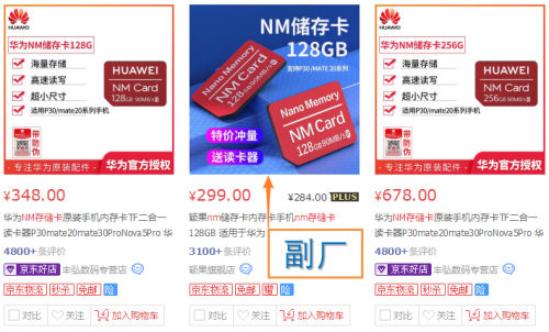 不过,NM卡诞生一年多来,其销售市场并不太成熟。首先,NM卡的品牌过于单一,市场仍以原厂(华为)为主,副厂清一色的杂牌,并没有存储大厂参与其中。其次,原厂卡仅在华为商城销售,京东天猫卖原厂卡的均非官方店铺,销售渠道宽度有限不利于消费者选购。