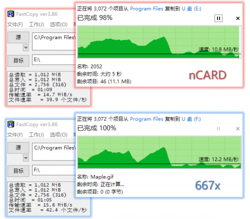 写入速度:nCARD为14.7MB/s,667x为15.6MB/s