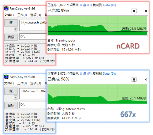 读取速度:nCARD为59.3MB/s,667x为62.0MB/s