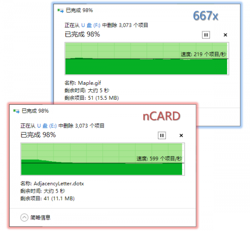 删除相当于特殊的写入操作,有意思的是,nCARD删数据更快,而且快两倍!