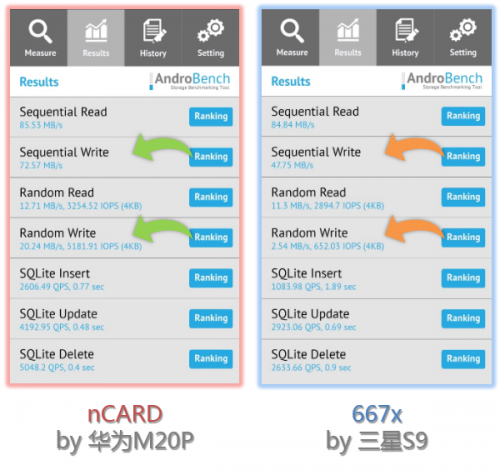 从实测体验来看,nCARD的性能表现并没有让人失望,无论读卡器接电脑、读卡器OTG还是直插手机,顺序读写能力都符合标定,随机写入速度更超出预期,即使与雷克沙同门标定略高的667x对决,nCARD的综合实力也不落下风。最难能可贵的是,nCARD与华为手机完美兼容,性能几乎无衰减,绝对是乞丐版华为旗舰机的优选配件!