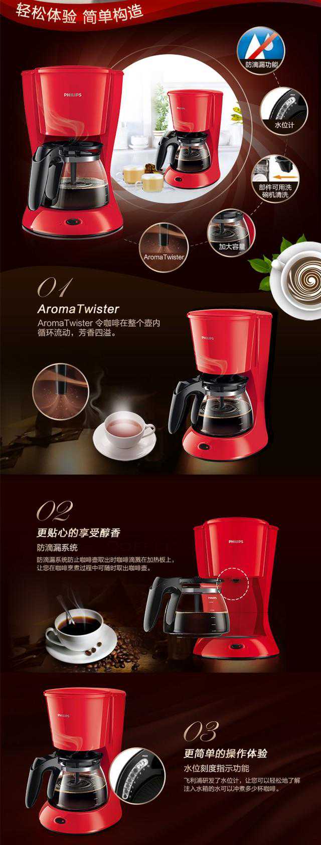 这款飞利浦咖啡机外观摩登时尚、设计简约、外形小巧;独特的循环系统令咖啡在整个壶内循环流动,芳香四溢;1.2L大容量水箱,一次可轻松烹煮10-15杯香浓美味咖啡;防滴漏功能可随时中断冲煮过程;可用洗碗机清洗的部件,易于清洗;飞利浦研发的水位计可轻松了解注入水箱的水可以冲煮多少杯咖啡;可分离式过滤网,部件可拆卸、可用洗碗机清洗。