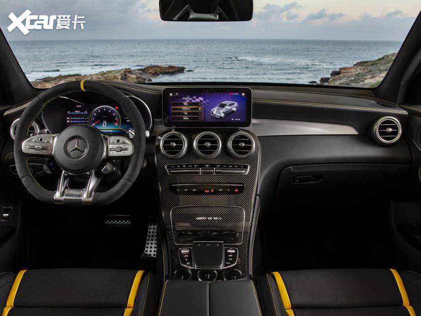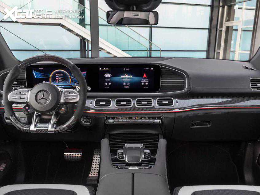 GLE63S的内饰采用了最新的家族式设计,双连屏设计科技感十足,空调出风口区域采用了碳纤维饰板装饰,全新样式的AMG版方向盘为碳纤维材质,3点和9点位置使用Alcantara材质包裹,驾驶模式选择和悬挂调节按键被放置在了方向盘内圈,方便驾驶员随时进入战斗状态。