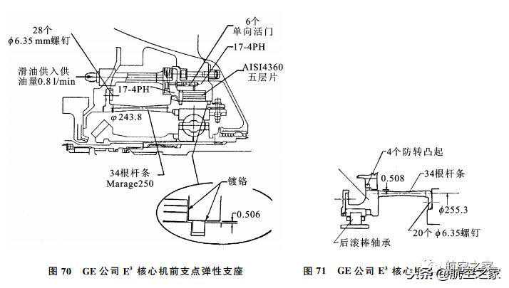 E3核心机后支点的弹性支座类似于其前支点的弹性支座,也是拉杆式的如图71所示,共有34根锥形杆条,限幅环的限幅间隙也是0.506mm,但它没有采用挤压油膜。