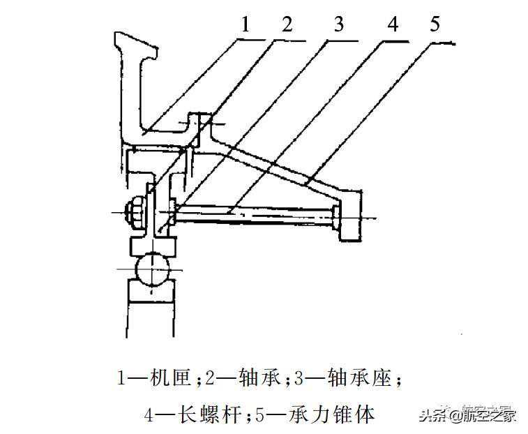 图72中示出了V2500等发动机高压压气机前支点采用的弹性支座示意图,它是典型的折返式拉杆弹性支座,弹性支座是由向后伸的承力锥体5、多根长螺杆4与安装轴承的轴承座3组成。