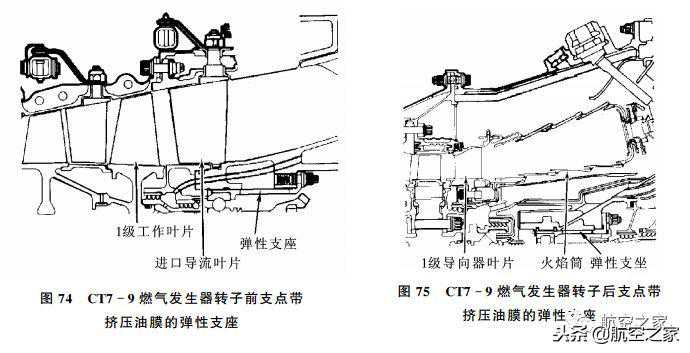 其他一些发动机,例如J69、J100、PW2037、PW4000、V2500、GE90、T65和T72等发动机中,TM333、TM319等燃气发生器转子中,RTM322、T700和CT7等发动机的燃气发生器、动力涡轮中均采用了带挤压油膜的弹性支座。图74、图75和图76分别示出了CT79涡桨发动机燃气发生器转子前支点(轴流压气机前)、后支点(离心压气机与涡轮间)和燃气发生器前支点(图34中的5号支点)所采用的带挤压油膜的弹性支座的结构图。