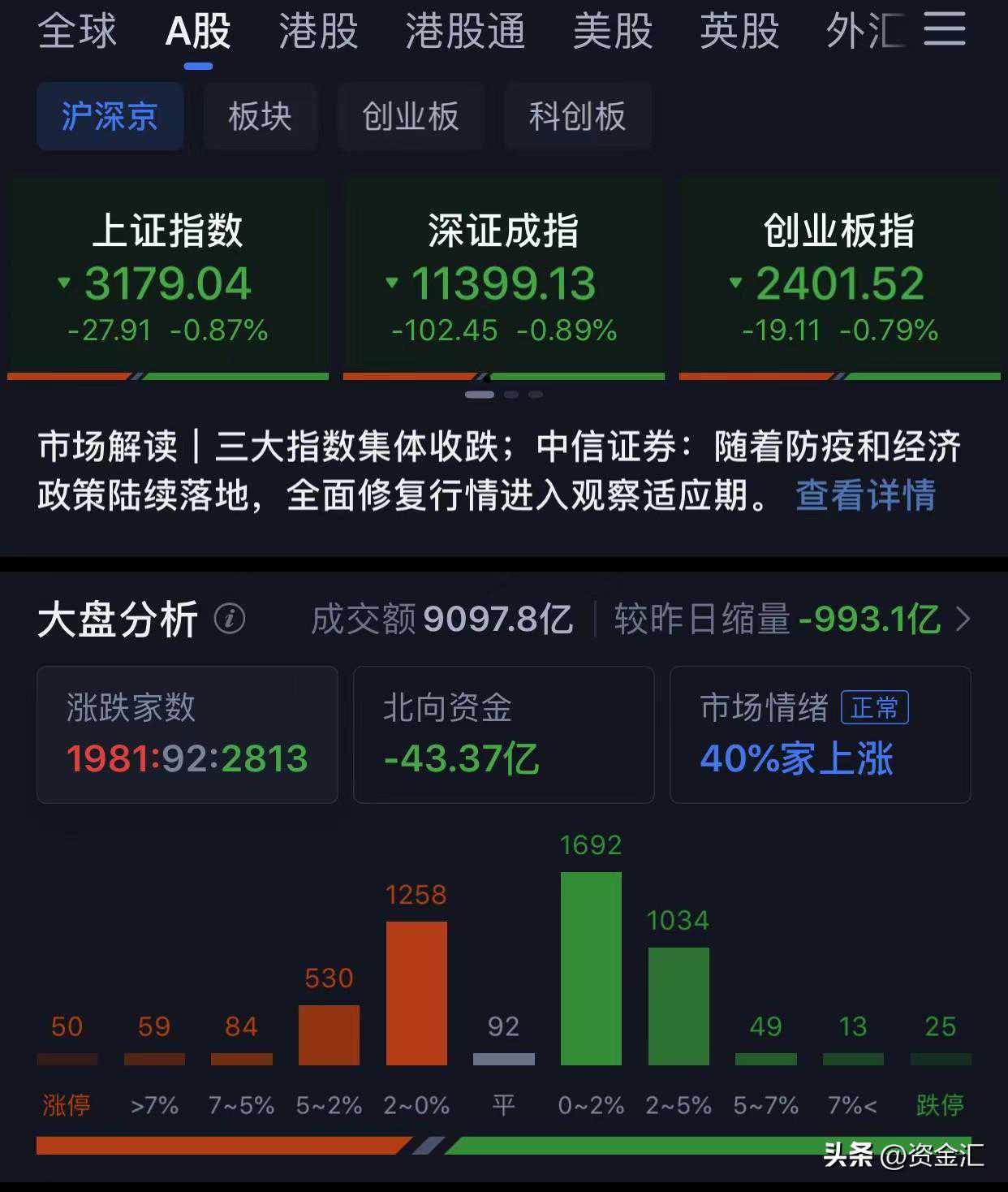 两市成交量(9097亿,较昨日缩量993亿)