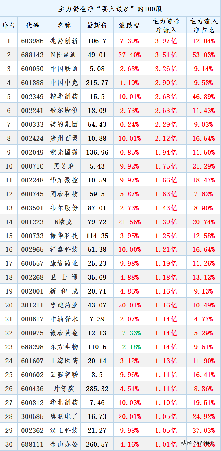 主力最大流入30股
