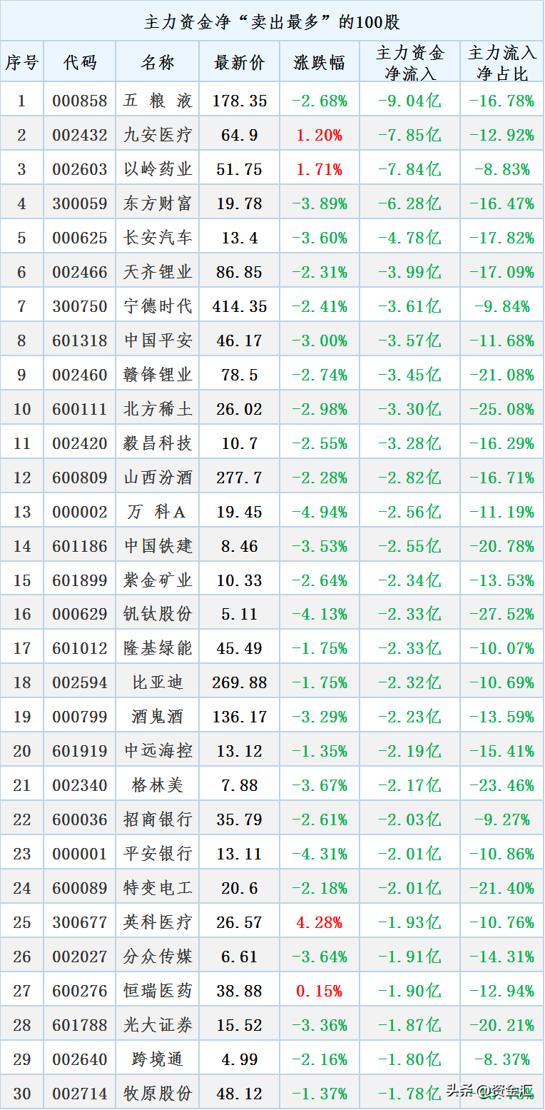 主力最大流出30股