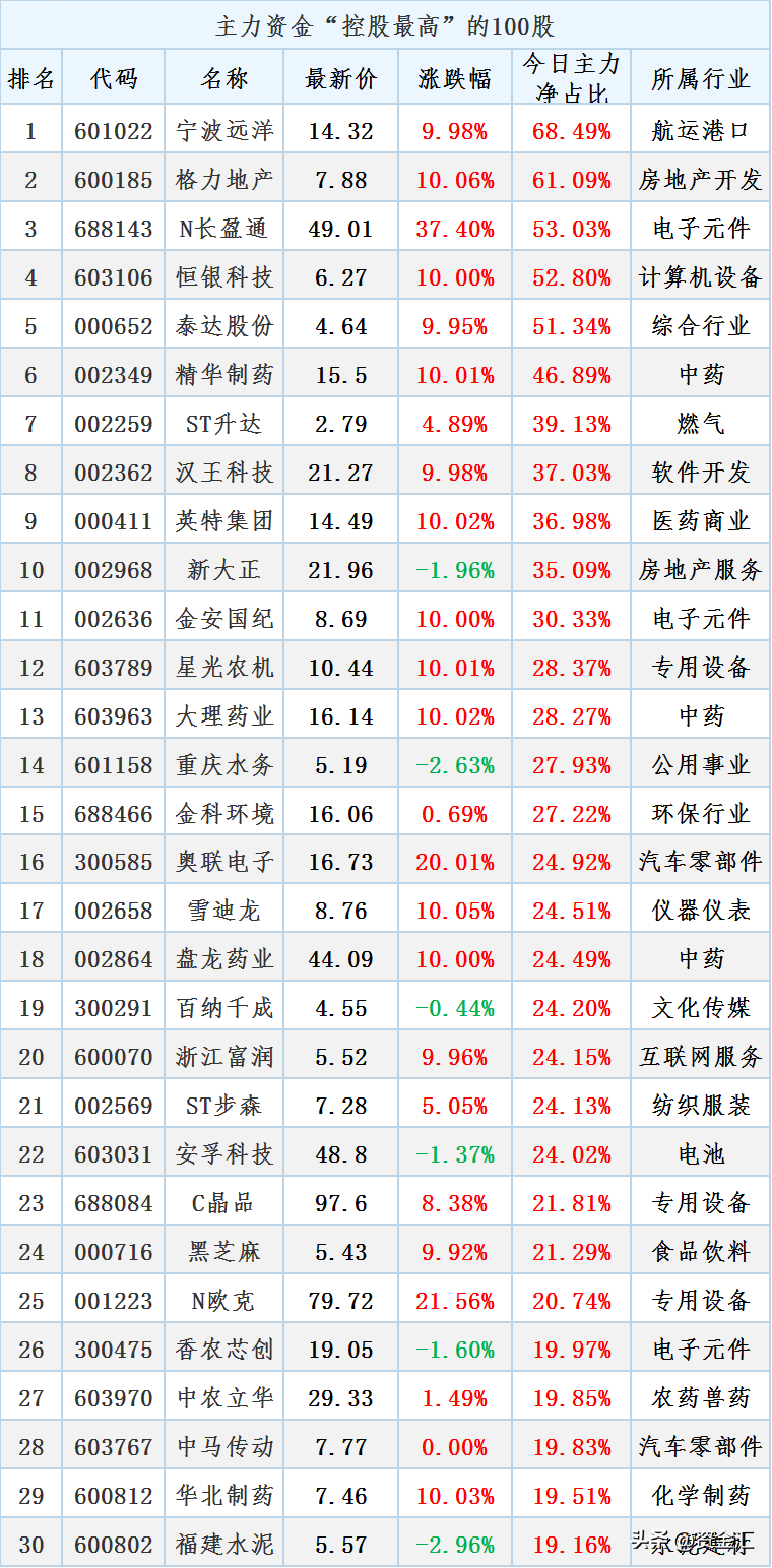 主力流入占比前30股