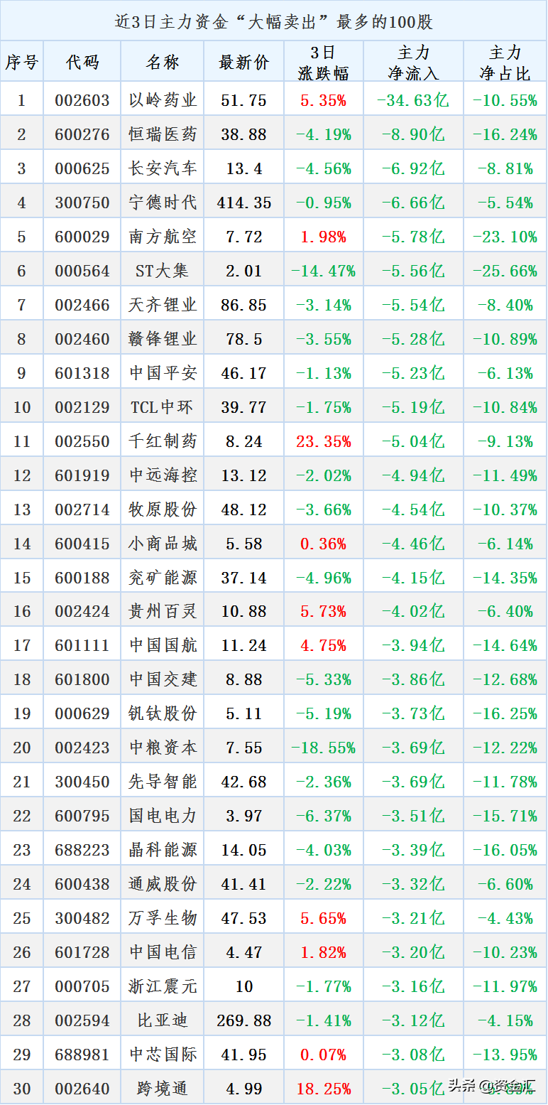 近3日合计主力最大流出30股
