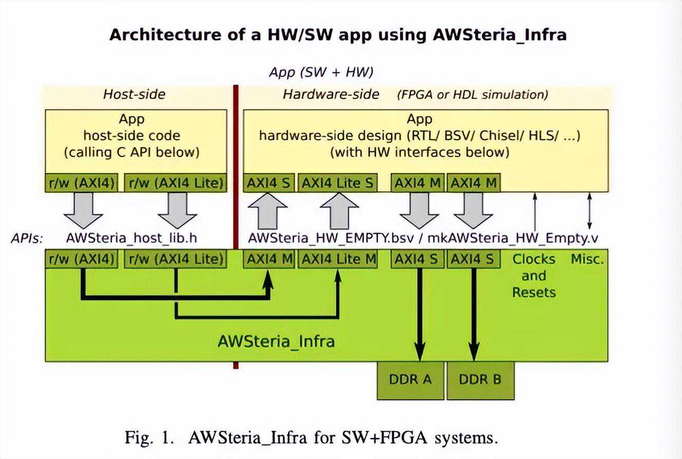 AWSteriaInfra是一个使用BSV编写的系统,用于简化由主机计算机上的软件与FPGA上的硬件进行通信的应用程序的设计。图1显示了AWSteriaInfra和一个应用程序的结构。主机上的C代码和FPGA上的BSV代码为应用程序提供了简单的接口(AXI4和AXI4Lite)。FPGA上的BSV代码还提供了对FPGA板上DDR内存的简单接口(AXI4)。这些接口类似于亚马逊的aws-fpga开发工具包中提供的所谓“shell”,但可用于更广泛的平台。