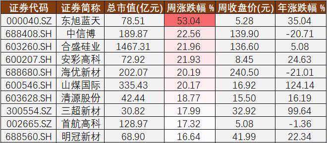 东旭蓝天(000040.SZ)、中信博(688408.SH)、合盛硅业(603260.SH)、安彩高科(600207.SH)在板块内领涨,涨幅分别为53.04%、22.56%、21.96%、21.93%。
