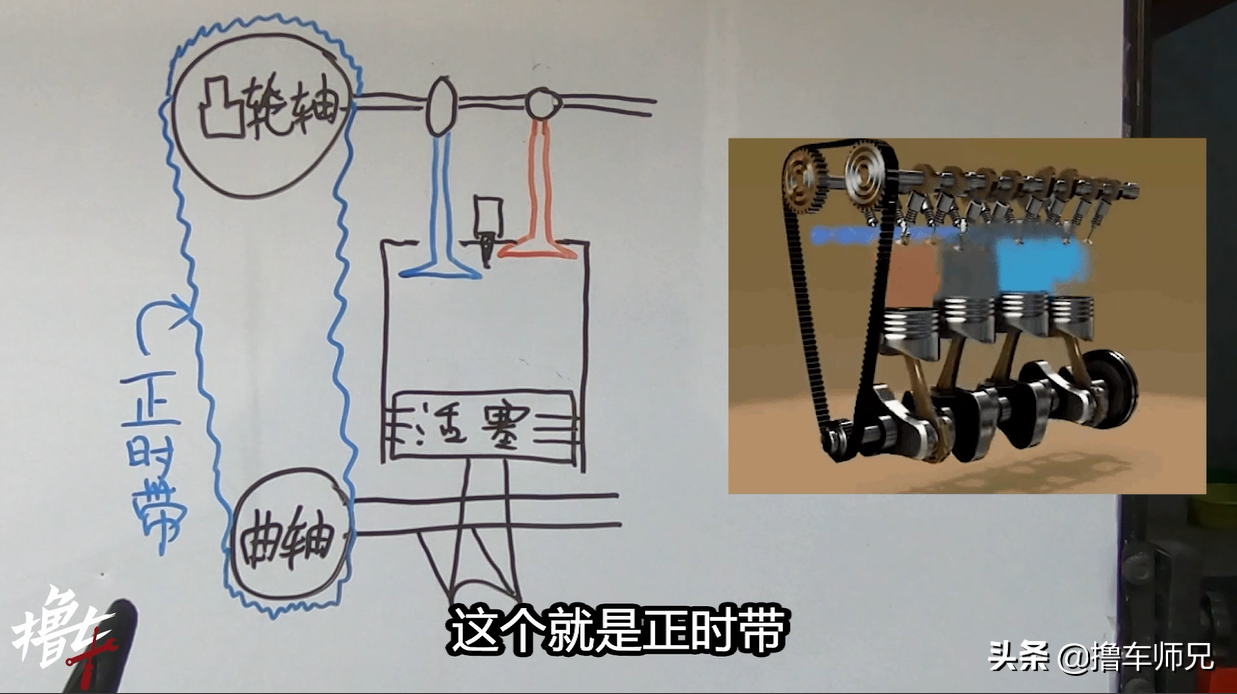 所以连接气门的凸轮轴,和连接活塞的曲轴之间,就需要一根带子,来确保气门的开关和活塞上下的动作是同步进行的,这样发动机才能正常工作,那么这根连接的带子就是“正时带”,而正时带的材质有两种:金属材质的正时链条,和橡胶材质的正时皮带;