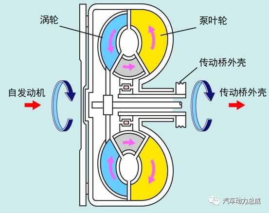 很多叶片安装在涡轮上,如同泵叶轮那样。这些叶片的曲率方向与泵叶轮叶片的相反。涡轮安装在传动桥输入轴上,使涡轮内的叶片与泵叶轮叶片相对,在两者之间由一很小的间隙。