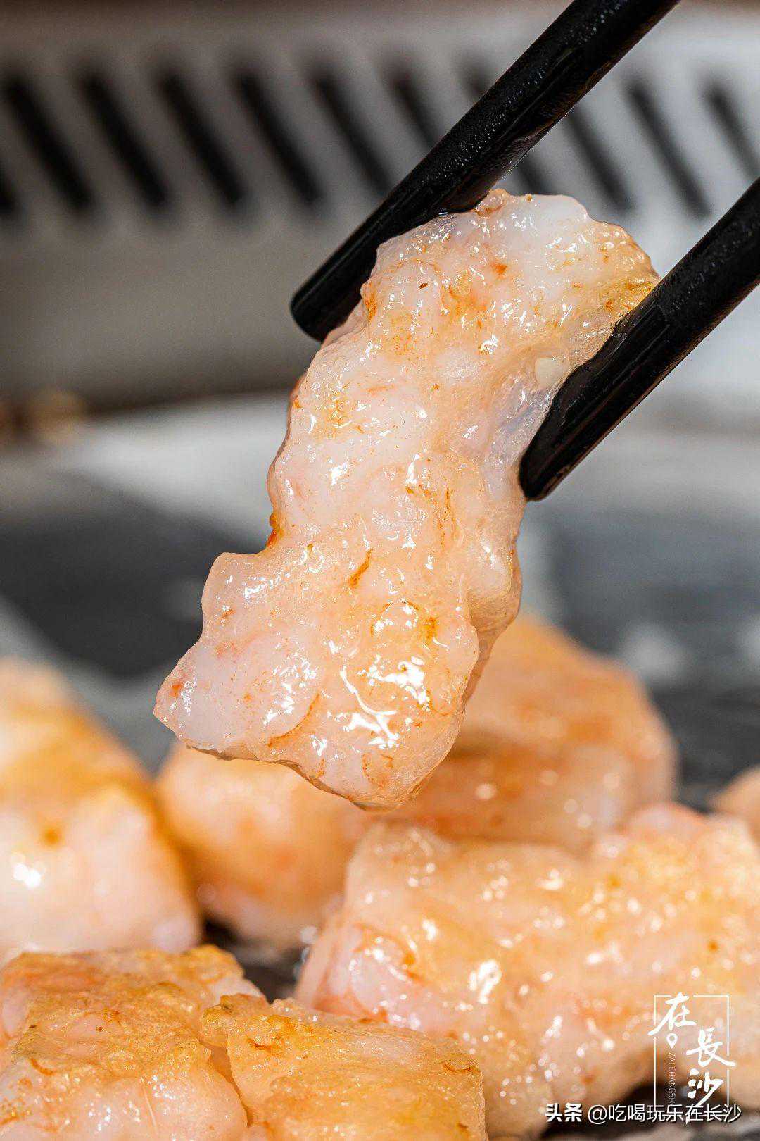 么子这道烤虾滑,含虾量高达百分之95以上,么子烤肉就是长沙第一家,把火锅菜虾滑带到铁板烤肉上的。
