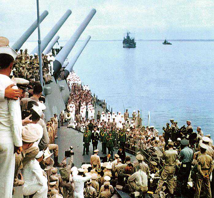 ■1945年9月2日,在"密苏里"号战列舰的甲板上举行日本投降签字仪式。如果日本拒不投降,那么太平洋战争将以更残酷的方式结束。