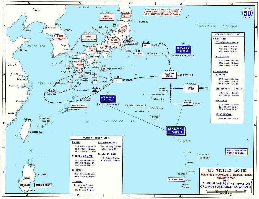 1945年8月6日、9日,美军先后在广岛、长崎投下原子弹。8月8日,苏联对日宣战,9日凌晨百万苏军席卷中国东北,暴揍关东军。上述事件直接促使日本天皇于8月15日颁诏乞降,在为太平洋战争画上休止符的同时,也将军事史上规模最大的两栖登陆作战——"没落"行动永远封存在保险柜中。假如日本政府决策层在原子弹的打击下依旧冥顽不灵,坚持所谓"本土决战",那么在1945年冬季降临时,整个日本民族将遭受一支空前庞大的舰队及两栖部队的猛烈攻击,其规模将超过1944年的诺曼底登陆。