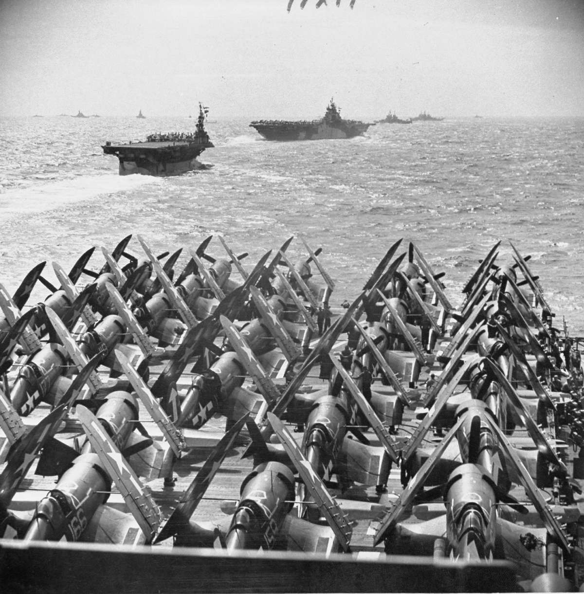 ■1945年2月准备参加硫磺岛战役的美军TF-58特混舰队的航母群,在"没落"行动中航母舰载机部队将承担大量空中支援任务。