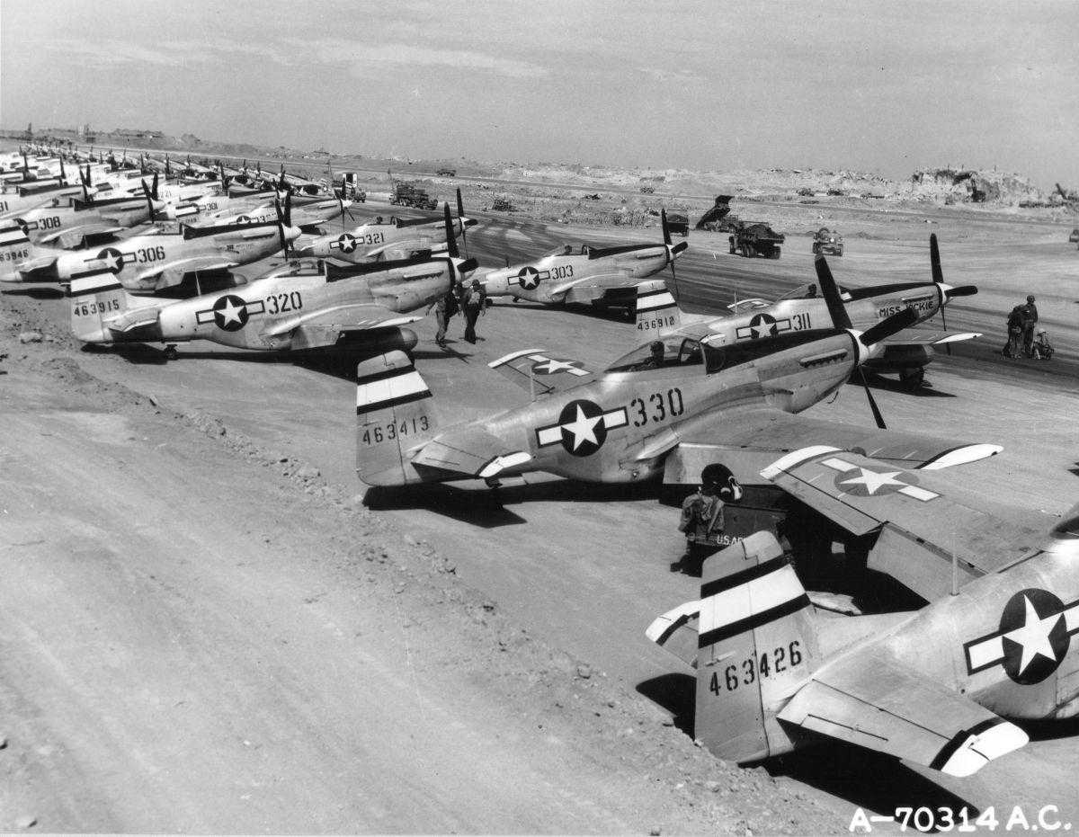 ■1945年春季,部署在硫磺岛机场上的美军P-51战斗机群,它们将为"没落"行动提供支援。